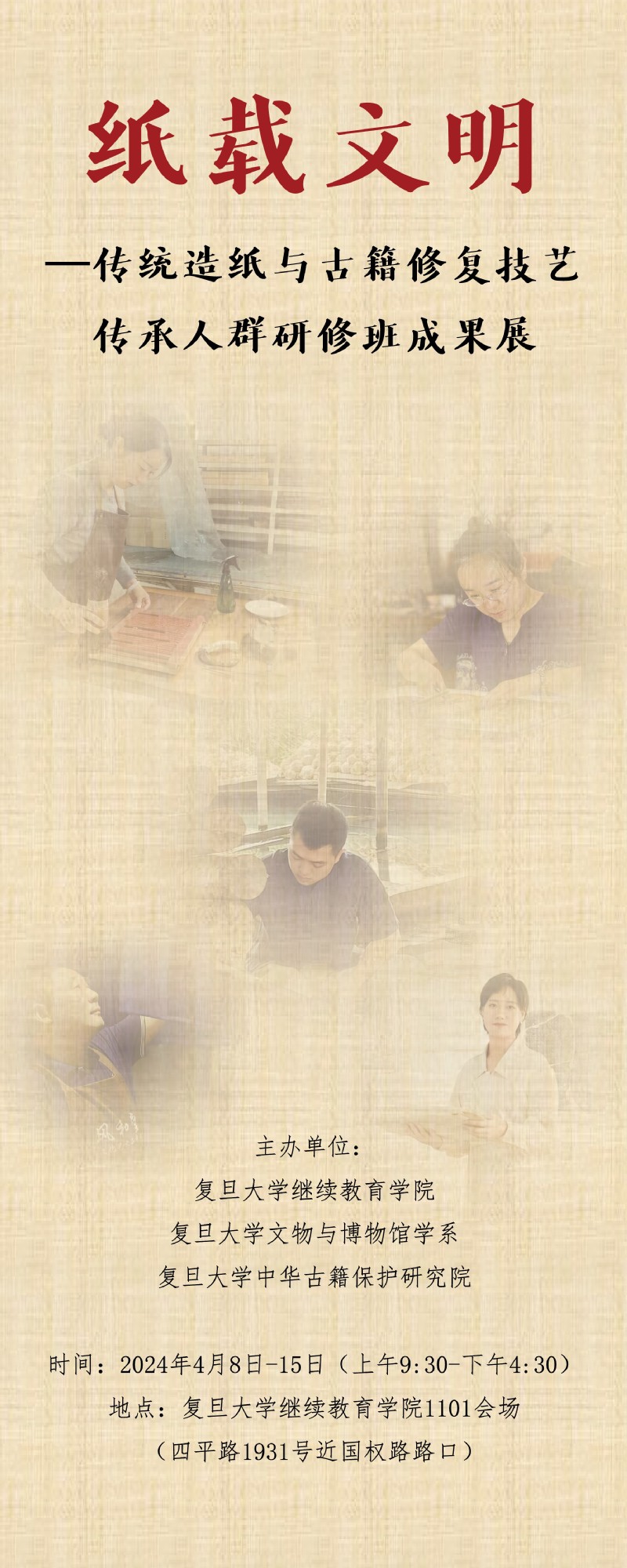 纸载文明——传统造纸与古籍修复技艺传承人群研修班成果展于2024年4月8日至15日在pg电子中国官方网站继续教育学院1101会场展出。