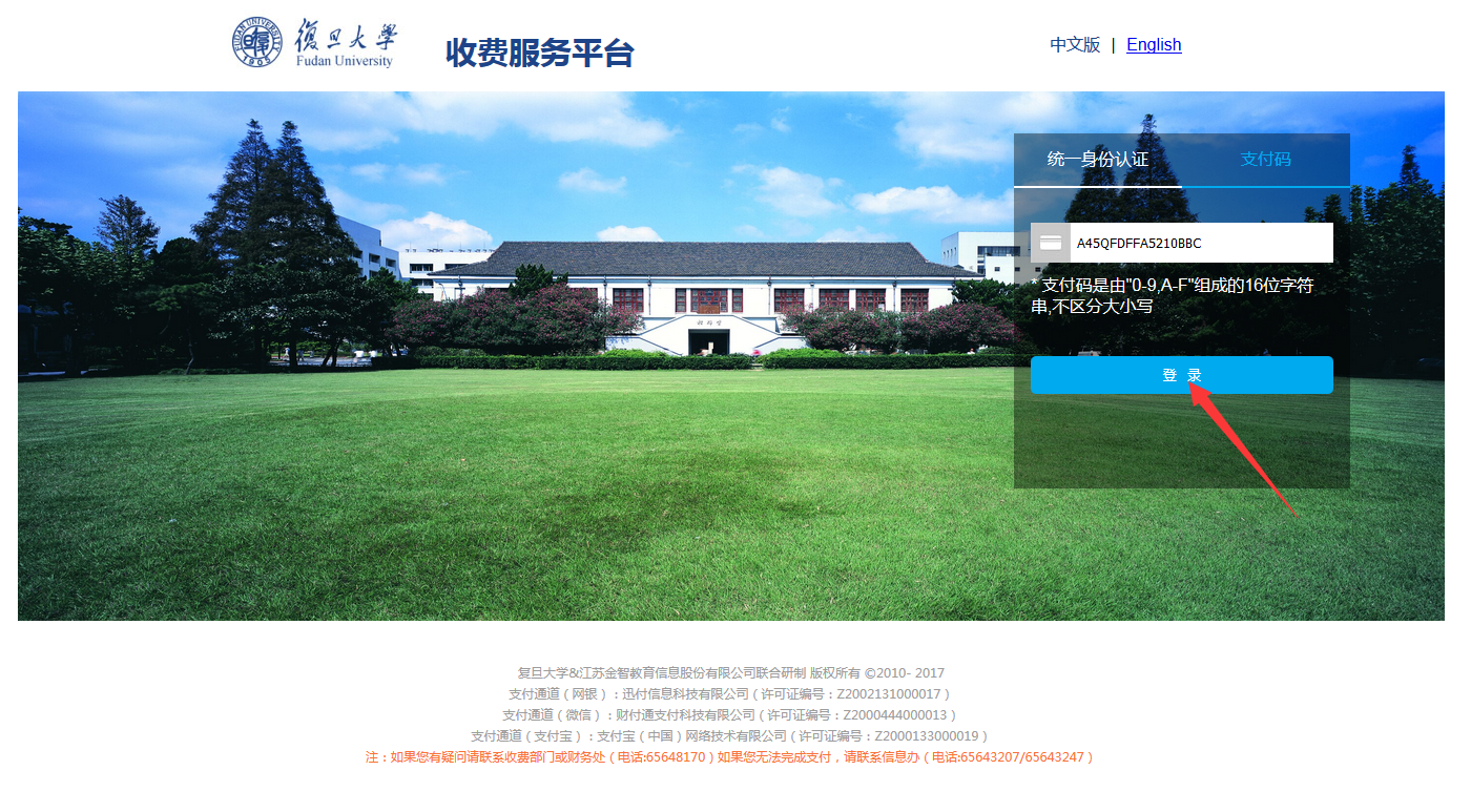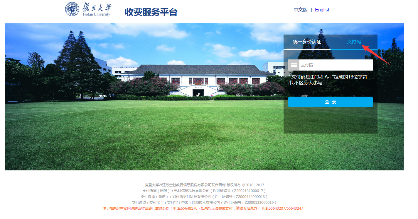 1、打开付费网址http://www.payment.fudan.edu.cn/点击右上角“支付码”按钮