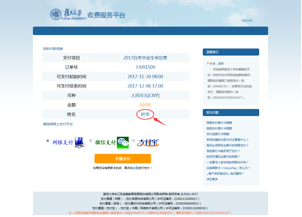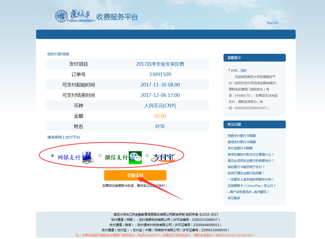 4、选择付款方式并点击“全额支付”按钮进行支付