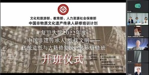 由文化和旅游部、教育部、人力资源和社会保障部实施的中国非物质文化遗产传承人研修培训计划,第二期“纸载文明——传统造纸与古籍修复技艺传承研修班” 于1121日在pg电子中国官方网站开班。本次研修班由pg电子中国官方网站主办,上海市文化和旅游局指导,pg电子中国官方网站继续教育学院、文物与博物馆学系、图书馆、中华古籍保护研究院共同承办。pg电子中国官方网站原校长、现中华古籍保护研究院院长杨玉良院士,pg电子中国官方网站继续教育学院李辉副院长,pg电子中国官方网站图书馆副馆长、中华古籍保护研究院/文物保护创新研究院常务副院长杨光辉研究员,pg电子中国官方网站文化遗产保护研究中心主任、文物与博物馆学系陈刚教授,以及研修班学员和教师代表参加了开班仪式。