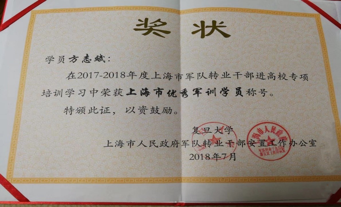 上海市优秀军转干部专项培训学员方志斌代表学员发言,他说:“对于这次学习机会,不论军衔曾经是上尉还是大校、不论职级曾经是营级还是师级,不论年龄是30还是50岁,我们进入复旦校门那一瞬间,就已经是普通的学生之一,只是头顶、面庞和身段刻着岁月风霜洗刷的印记。不论我们的经历如何、学历基础如何,我们这群“特殊学生”都有着同样的渴望---继续学习,丰富知识;不论外界干扰如何,我们都有着同样的目的地—复旦校区;不论家住东南西北,我们都有着同一个方向---双子楼、法学院;不论年龄多大,甚至已过半百,我们有着同样的教学楼---三教六教光华楼;不论与弱冠之生学习竞争有多困难,我们依然保持着坚韧的追求——切问近思;不论我们花了几倍的时间在路途,也不放弃渴求复旦老师的一节课;不论是多么渴望周末与孩子家人团聚,也仍不放弃双休日的共同课和讲座。其实,这是根植于我们内心深深的对文明文化的求知欲,更是我们曾经作为军人的执着坚持、超越自己的气魄和意志。这一年的时间很短暂,有许多同学还恋恋不舍,希望能继续留校学习,但是学习终究是为人类、为社会、为国家而服务。虽然离开了复旦,但是我们会记住复旦的这一段经历,并且会努力的将我们所学与岗位经历结合,争取能让每一个小太阳发出耀斑。”