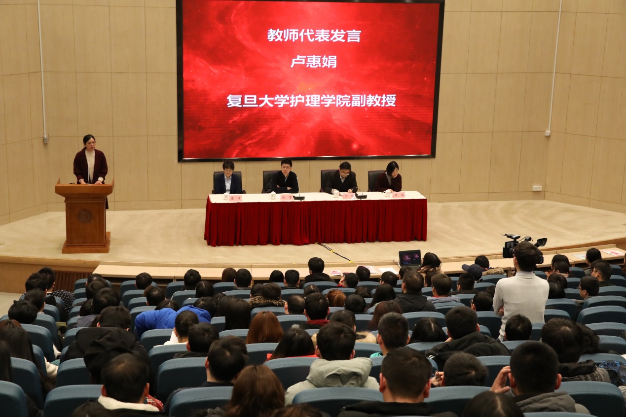护理学院卢惠娟和马克思主义学院刘学礼分别作为枫林和邯郸校区的教师代表发言,在提请同学们珍惜学习机会的同时,卢老师告诫新同学要统筹协调好自己的工作与学习的关系,希望每个同学都有决心、恒心、专心、诚心、开心、感恩心,努力学习,今后为社会做出更大的贡献;刘老师则强调大学不仅传授知识和技能,更是培养科学思想、方法和精神,希望大家为实现梦想而加倍努力。“你们的进步,就是我们的快乐,你们的成功,就是我们的幸福。”道出了夜大学全体任课教师的心声。