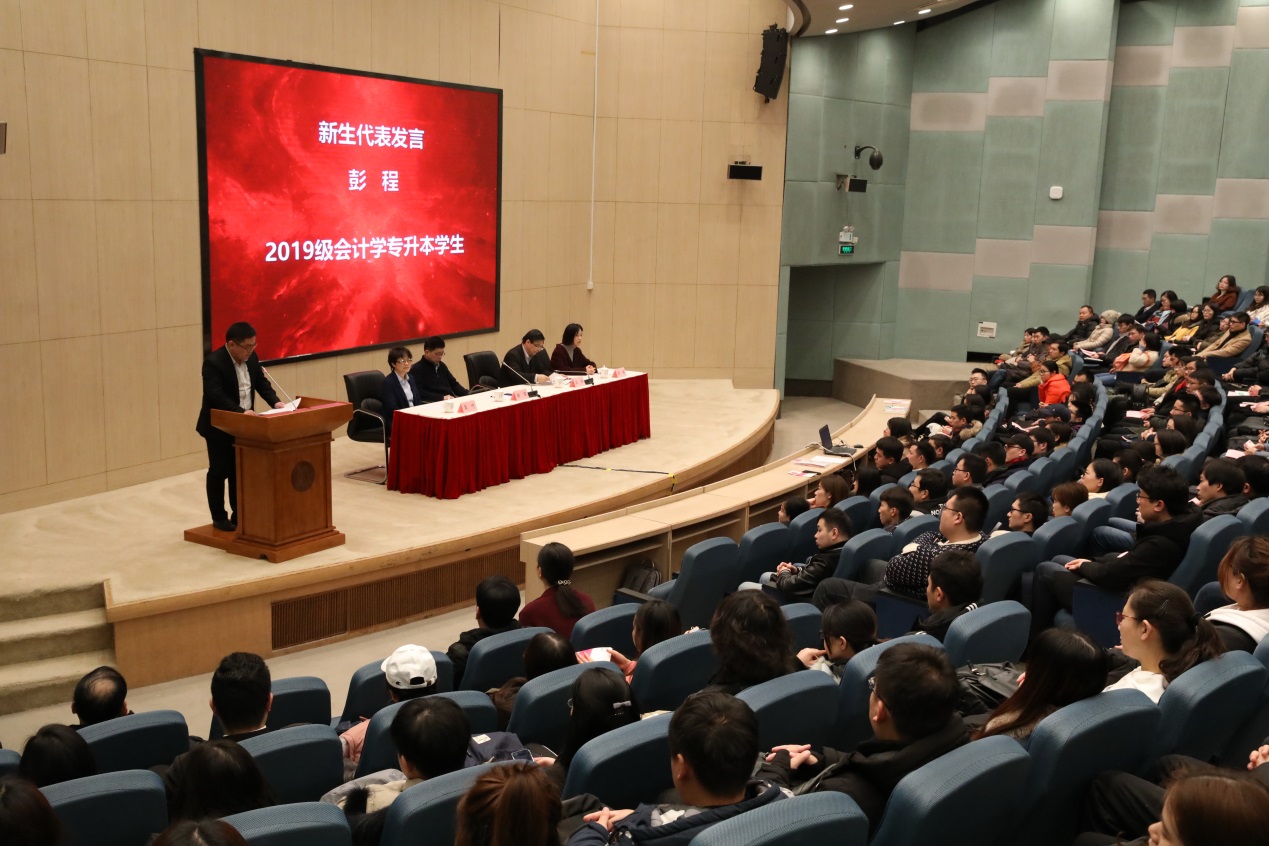 2019级会计学专业专升本的彭程同学作为新生代表发言。他曾获得北京科技大学学士,德国亚琛大学硕士,如今来追寻他的复旦梦。他以“进取、善良、坚持、责任”四个词来概况了自己的入学感言,号召同学们以进取为动力,善良为导向,坚持为信念,责任为目标,向美好的学习生活进发!